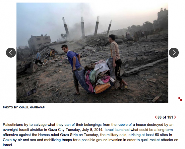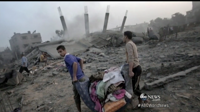During Tuesday report on the unfolding crisis in Israel, ABC News showed a photo with Diane Sawyer describing itas Israelis “trying to salvage what they can” after a Palestinian attack. However, that photo is actually of Palestinians walking through rubble after an Israeli airstrike.