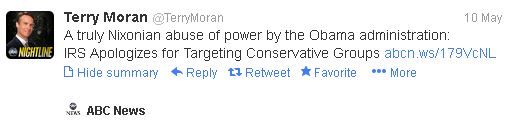 On Friday morning Moran tweeted, “A truly Nixonian abuse of power by the Obama administration: IRS Apologizes for Targeting Conservative Groups.”
