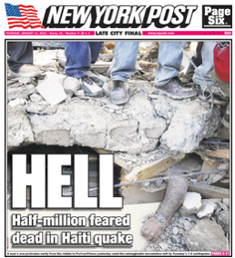 Admittedly, one does not necessarily turn to the cover of the New York Post for hard news. But come on. The paper which devoted 20 consecutive covers to Tiger Woods has thus far made space for the Haiti disaster once this week. That was yesterday.