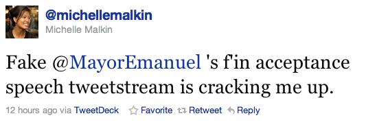 When Rahm Emanuel won his campaign to be mayor of Chicago yesterday, many people were curious to hear the reaction of his former boss, President Obama. Many other people, though, were curious to hear the reaction from @MayorEmanuel, the foul-mouthed fake Twitter persona that’s become so popular that the real Emanuel offered a “$2,500 or $5,000 personal contribution” to charity for the writer’s identity. Sure enough, the Twitter feed delivered last night, entertaining many…including Michelle Malkin who ended up getting in a joking fight with the fake Emanuel. However, this morning, she’s ended up in a real fight trying to prove she knew it was a joke.