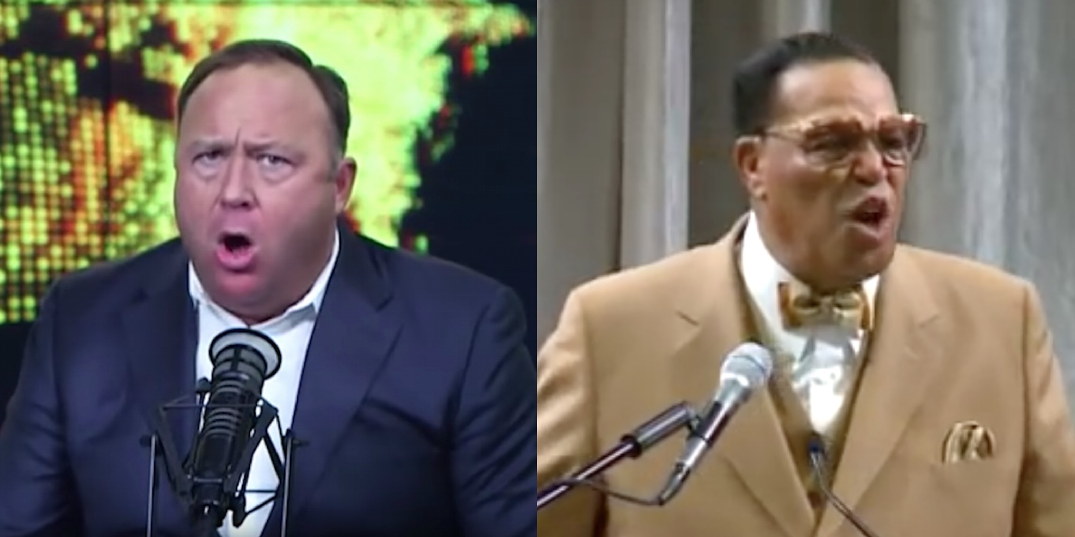Farrakhan, founder of Nation of Islam, is an outspoken anti-Semite, homophobe, racist, misogynist, and like Alex Jones, a vile human being. He’s called white people “potential humans,” Adolf Hitler a “very great man,” and literally blamed Jews for 9/11.