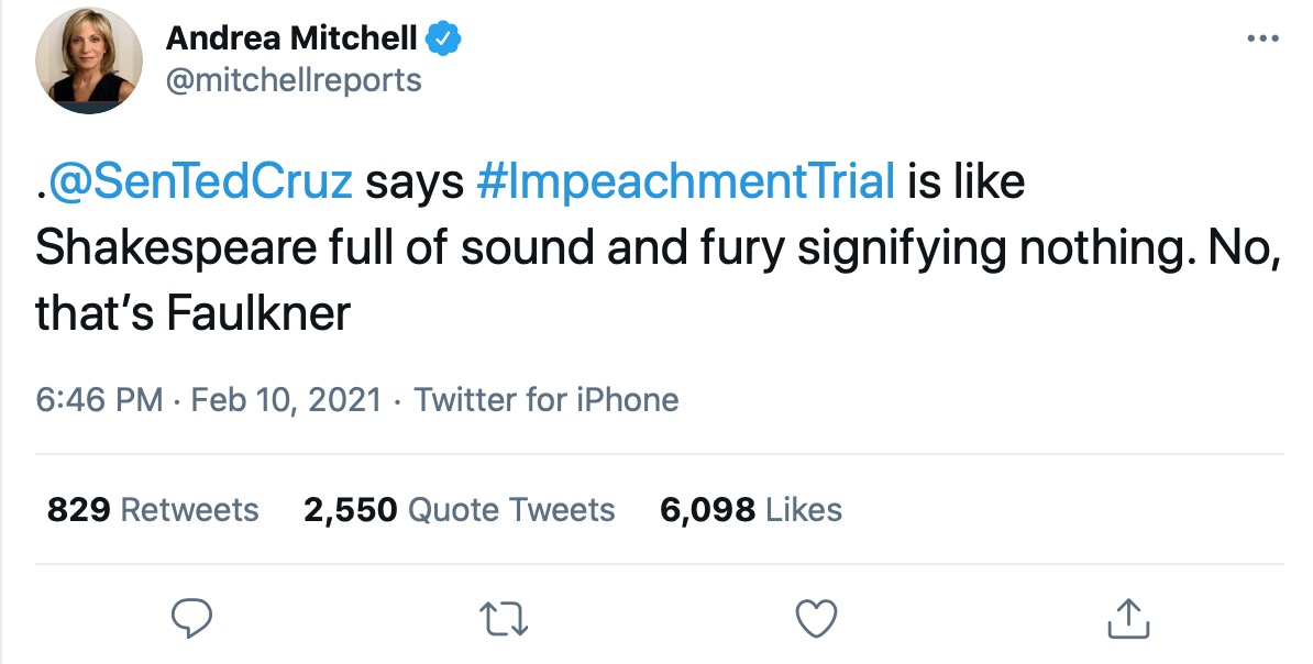 At one point, Mitchell noticed Cruz quote William Shakespeare as he panned the impeachment as “full of sound and fury signifying nothing.” The NBC anchor took to Twitter in order to claim that Cruz got it wrong and it was from William Faulkner.