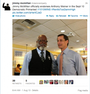 Yep, Weiner has officially been endorsed by the “Rent is Too Damn High” guy from the most last New York gubernatorial race, where his showy debate performance garnered laughs even from the moderators. McMillan just posted a picture of the two men together along with his “official” endorsement: