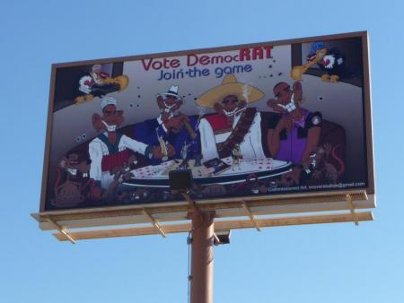 The billboard, erected along the I-70 Business Loop between 28 1/2 and 29 roads sometime Monday, depicts the four “Obamas” sitting around a table with playing cards showing only sixes bunched in groups of three.
