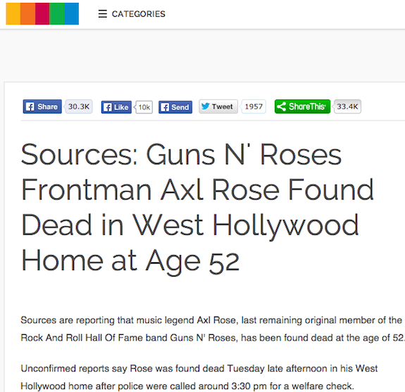 It appears we have the world’s first hoax serial killer on our hands. Only weeks after Judd Nelson was reported dead by a fake Fox News website, a fake MSNBC site is now reporting that Axl Rose was found dead in his home at the age of 52.
