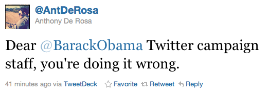 You know that friend of yours who’s always the first to get in on the hottest social media trends? The one who had a Tumblr before everyone? The one who first sent you a Google+ invite? Well, remember that one time that your hip friend made a big misstep? Like he joined some online service which lets you tag people in your dream journal or “like” porn videos and he swore that it was gonna be the next big thing even though it clearly wasn’t? Yeah well, today, President Obama’s campaign staff is kind of like that as they’ve initiated a day-long project to tweet out the Twitter names of every Republican Congressmen state by state…in individual tweets.