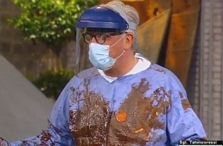 Beck got dressed in the same attire that the Dallas nurses were supposedly dressed in. Stu Burguiere then proceeded to throw spaghetti with sauce and chunks of sausage and pepperoni at him with a slingshot, to simulate projectile vomiting. The chocolate sauce was to simulate explosive diarrhea, and Burguiere squirted as much as he could all over Beck.