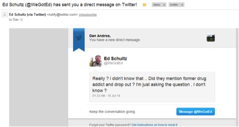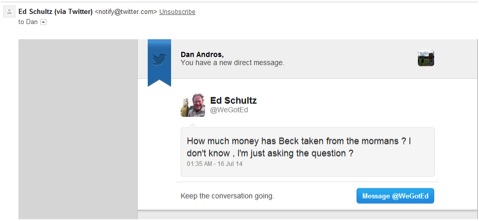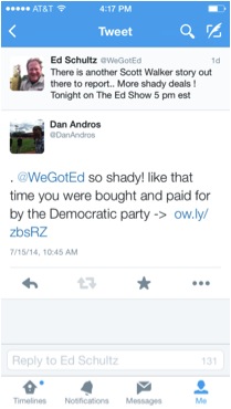 The Blaze’s Dan Andros wrote this morning that MSNBC host Ed Schultz sent him some weird late night DMs on Twitter. See, what apparently happened was that Schultz tweeted out something about “shady” deals Scott Walker‘s been connected to. Andros decided to flip the tables on Schultz, but actually got an answer from the MSNBC host.