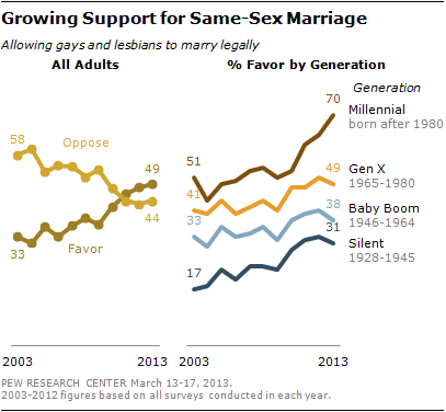 Naturally, a hearty chuckle from both over-the-hill contributors ensued. Both seemingly neglecting that it’s not just those mid-20-somethings who believe in gay marriage more than ever. It’s also their generation, and every other generation. They are all experiencing an upward trend in support for marriage equality.