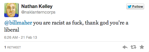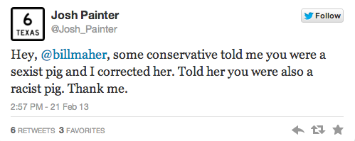 The tweet has garnered strong pushback from the political right, with conservative blogs like Twitchy calling the HBO host “Pig Maher” and lambasting his “disgusting racial joke.”