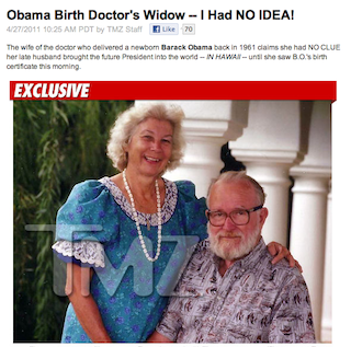 You know, sometimes people hating the president so much that they refuse to even believe he’s even an American can lead to good things. It’s rare but it happens. Take for example the family of Dr. David A. Sinclair who had no idea until a few hours ago that his name was on President Obama’s birth certificate. Ivalee Sinclair, the doctor’s widow, woke up this morning to discover that her late husband was the one who delivered the future leader of the free world. Talk about a nice surprise. TMZ interviewed her today and it’s clear that this was quite a charming little surprise.