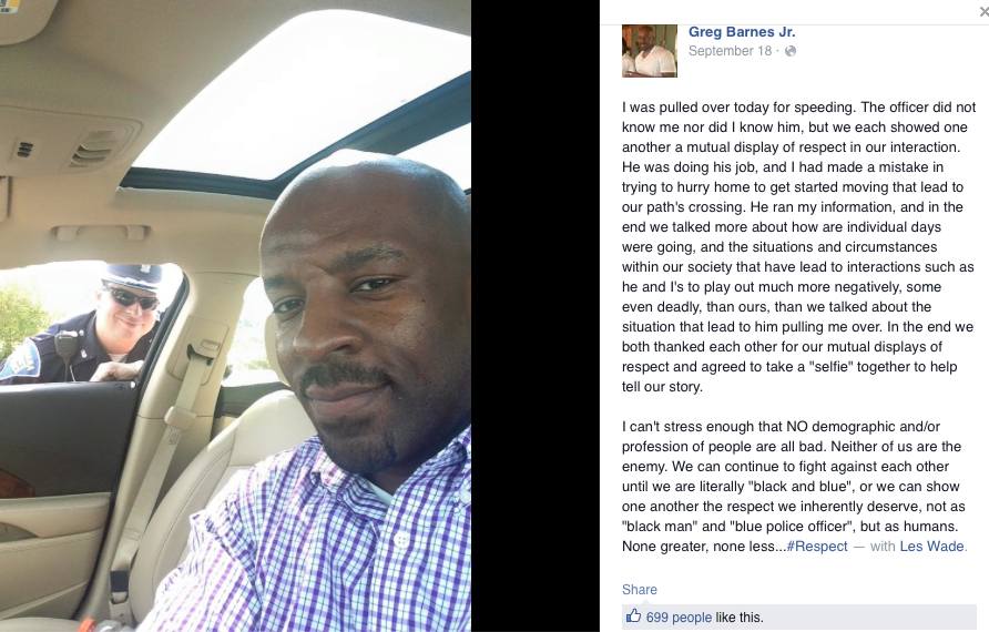 Grag Barnes decided to document his recent experience with a white cop who pulled him over for speeding, which later became a post on Facebook. The message explains that the encounter occurred with complete respect for one another, with the cop agreeing to take a selfie with Barnes before going their separate ways.