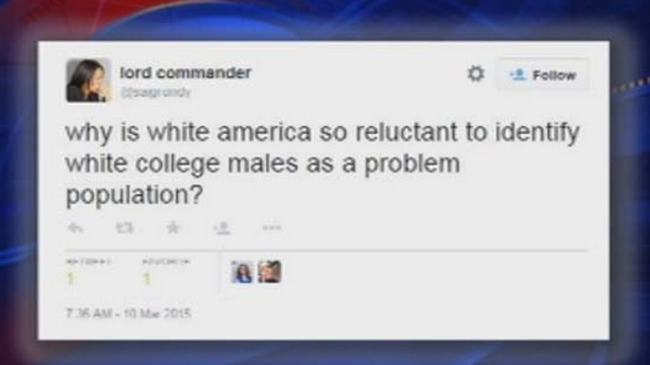 …calling “white college males” a “problem population,” declaring “white masculinity is THE problem for America’s colleges.” Other tweets stated “Deal with your white (expletive), white people. slavery is a *YALL* thing,” and “Every MLK week I commit myself to not spending a dime in white-owned businesses. And every year I find it nearly impossible.”