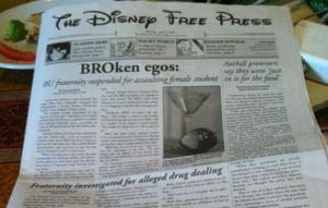 Boston University’s independent student newspaper, The Daily Free Press, printed their annual April Fools edition. The theme: Disney. The Disney Free Press. Adorable in theory and so many possibilities, right? For reasons unclear, the paper decided to print a lead story entitled “BROken egos: BU fraternity suspended for assaulting female student.” A tale about rape that — even neglecting the recent allegations against BU’s hockey team — is far from funny.