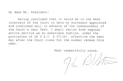 UPDATE: Talking Points Memo has acquired Justice Stevens’ resignation letter: