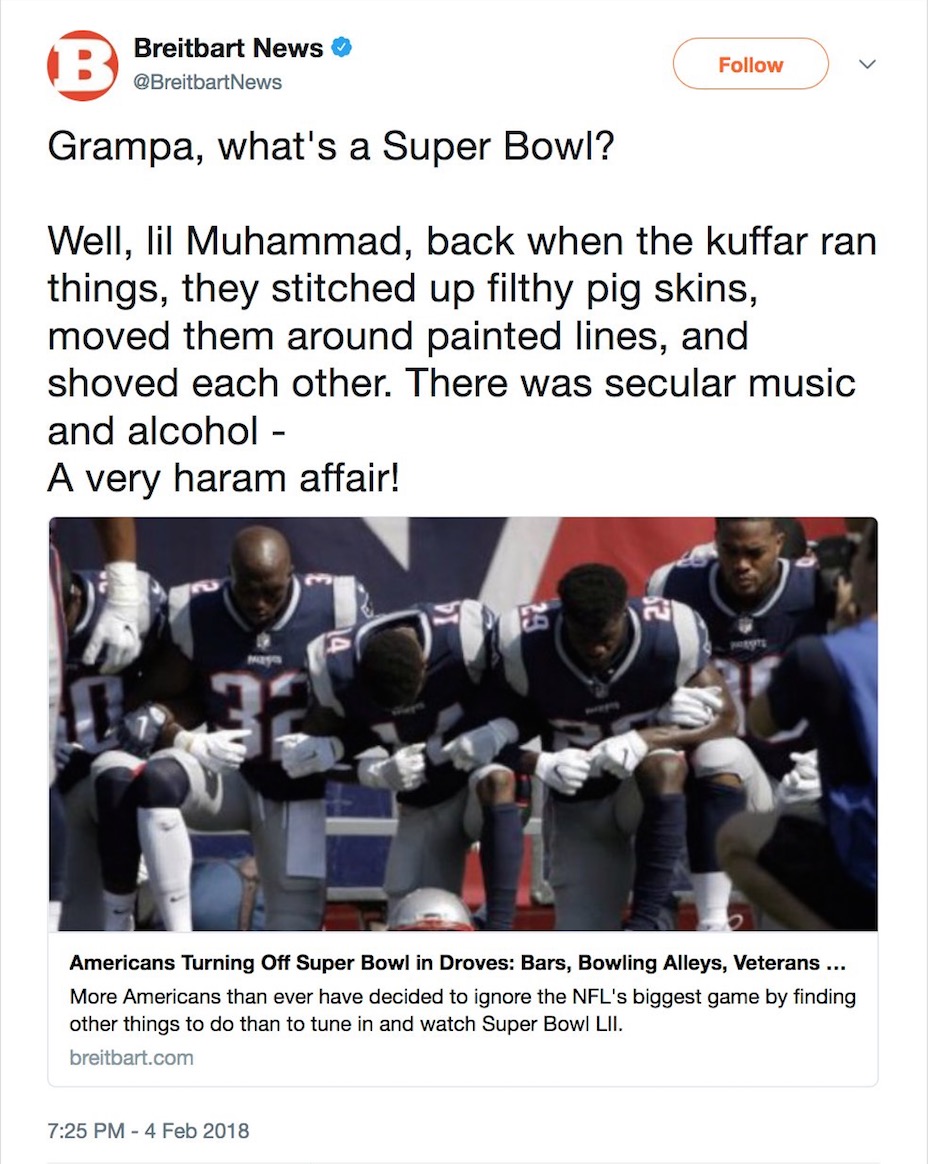 Breitbart Deletes Tweet Suggesting Muslims Will End Super Bowl: Did Not Meet ‘Editorial Standards’