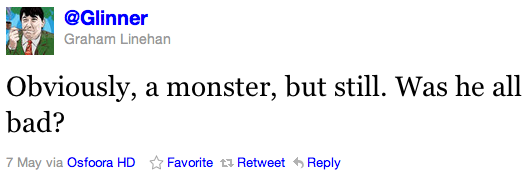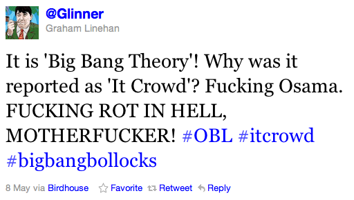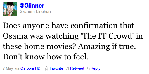 Last week, television writer Graham Linehan decided to have a bit of fun. Around the time we were all getting shown images of Osama bin Laden chilling on the couch and watching some TV, Linehan, the creator of the hit British sitcom The IT Crowd (Which I have not seen despite constant championing from my friends. It’s on my Netflix queue, guys!), thought it would be pretty funny to start a rumor on Twitter that the Bin Laden videos show the terrorist leader watching his show. Anyone who has ever read an article with the words “rumor” and “Twitter” in the headline can probably guess what happened next. Yes, it’s time for another Crazy Twitter Rumor Round Up™!