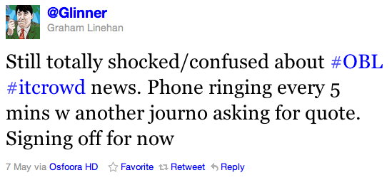 Eventually, Linehan had to give up the joke. After a day, it reached its natural conclusion as Linehan pretended to live tweet his viewing of the Bin Laden home videos (given to him, supposedly, by an official from the Irish embassy in Washington). At first, he tweeted about the opening credits being different than they should be. Then the punch line: