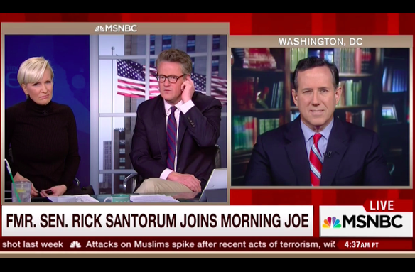 Things got heated when Scarborough asked Santorum, “At the same time we’re trying to stamp out Islamic radicalism [how do we] reach out aggressively to let Muslim-Americans know that they are every bit as part of the American dream as you or me?”. Santorum would not respond to that question directly, instead choosing to put the emphasis on the responsibility of the Muslim-Americans themselves.