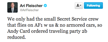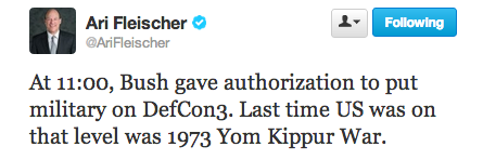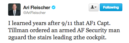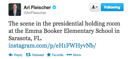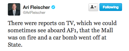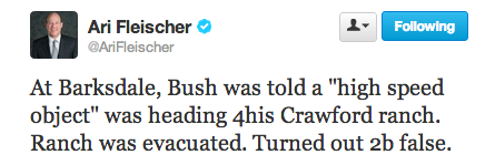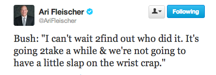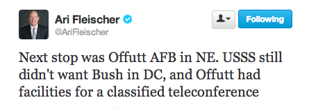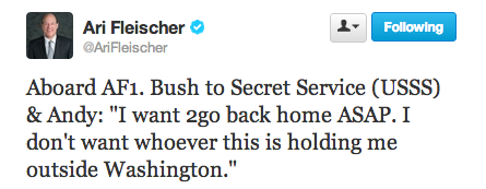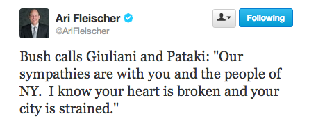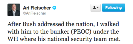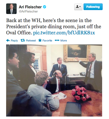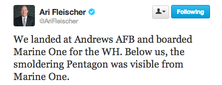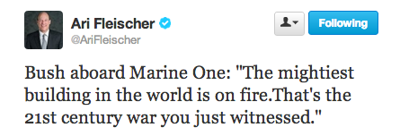 On Wednesday morning, the twelfth anniversary of the September 11 attacks, George W Bush Press Secretary Ari Fleischer tweeted a moment-by-moment recounting of the events of the fateful morning in 2001.