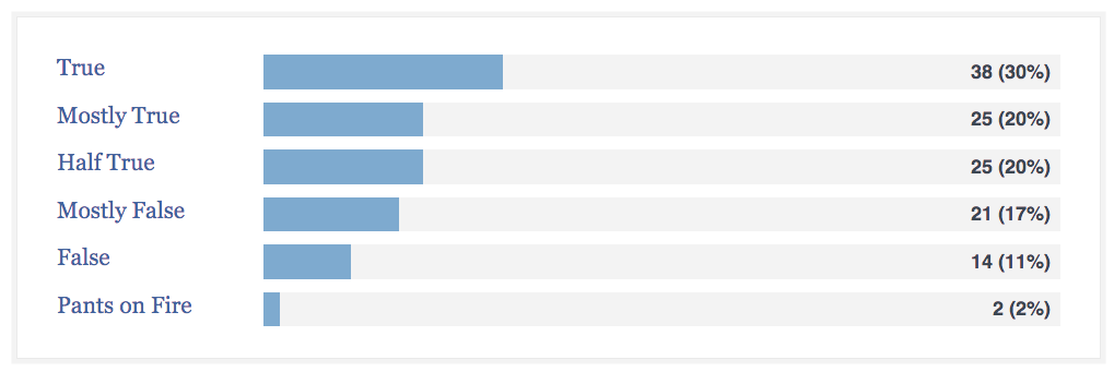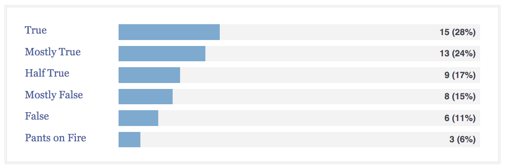 It seems like the minds at Politifact have been incredibly scrupulous covering Hillary Clinton statements, weighing in on 125 of them. Clinton rings ‘True’ on 38 claims, the highest percentage for any candidate in the race, and the far majority fall under ‘True’, ‘Mostly True’, and ‘Half True’. Her representative graph is here: