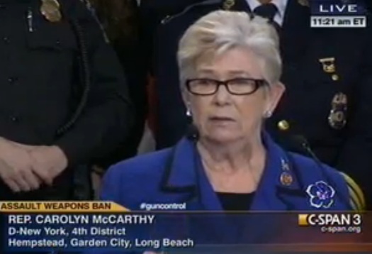 At a press conference in the Dirksen Senate Office Building Thursday morning, Senator Dianne Feinstein (D-CA) introduced an assault weapons ban that figures to improve on the 1994 ban that she co-authored, and which expired in 2004. One of the speakers at that press conference was Rep. Carolyn McCarthy (D-NY), whose husband was killed in a 1993 mass shooting, and whose son was wounded in that same incident. Rep. McCarthy spoke passionately about the gun massacres that have continued to occur since then, asking “What’s wrong with all of us? How many people have to be killed before we do something?”