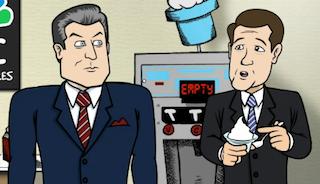 I have a dream. In it, Brian Williams and Jon Hamm both finally admit that they just want to be doing comedy full time. They then quit their day jobs and go on the road together as a hilarious two man comedy team. After cultivating their comedic personas and on-stage chemistry, the two embark on a successful series of buddy comedies beginning with my unproduced spec script, Brian and Jon on the Road to Marrakesh. Until this happens though, we’ll have to settle for both men continuously doing tiny, comedic side projects like this one in which a cartoon Williams fights a cartoon Alec Baldwin for frozen yogurt.