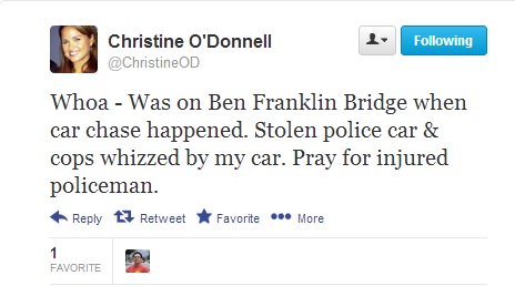 A high-speed chase that began in Camden, New Jersey this morning ended in North Philadelphia, but along the way, the action passed by a rather famous witness. Two suspects, a man and a woman, stole a Camden Police cruiser, and led cops on a chase across the border into Philadelphia, where the man was taken into custody, but the woman stole a second police car. Witnessing part of the action was former U.S. Senate candidate Christine O’Donnell, who later tweeted “Whoa – Was on Ben Franklin Bridge when car chase happened. Stolen police car & cops whizzed by my car. Pray for injured policeman.”