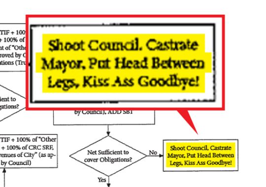 Yes, that reads “Shoot Council, Castrate Mayor, Put Head Between Legs, Kiss Ass Goodbye!” and yes, this was in the city council’s actual flow chart on how to deal with its debt issues.