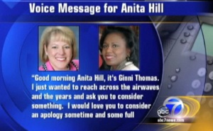 Well its safe to say that no one probably expected this coda to the story of the Clarence Thomas hearings. Multiple sources are reporting that Ginny Thomas, wife of Supreme Court Justice Clarence Thomas and Tea Party organizer left a voicemail asking for an apology from Anita Hill, the former staffer of her husband and central figure in the allegations of sexual harassment that led to the “public lynching” as Mr. Thomas called it himself.