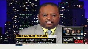 It was an interesting decision, and one CNN doesn’t always make. While the other cablers also devoted little coverage to the May 18 primary, CNN didn’t cover it much either. In fact, they made the odd decision to air a pre-taped one-hour Larry King interview with Mick Jagger right at 9pmET. Last night the priorities changed (or returned) and King was there covering the primaries.