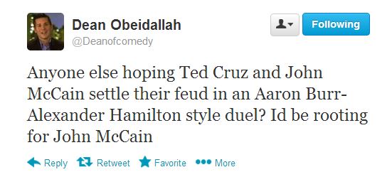 Comedian and CNN.com columnist Dean Obeidallah tweeted on Sunday that he was enjoying the nascent “Republican civil war.” He joked that he would like to see Sens. Ted Cruz (R-TX) and John McCain (R-AZ) settle their difference with a bloody duel in the fashion of Aaron Burr and Alexander Hamilton. Obeidallah added that he hopes McCain would win that duel.
