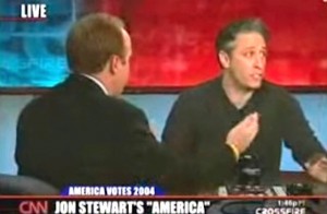 One of Jon Stewart‘s finest moments was his infamous Crossfire debate with CNN’s Paul Begala and Tucker Carlson. Stewart challenged both of them on the hollowness of their red versus blue show and cable news in general, even begging the two to “stop hurting America.”