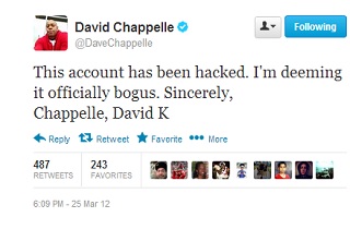 David Chappelle @DaveChappelle 25 Mar 12 This account has been hacked. I’m deeming it officially bogus. Sincerely,