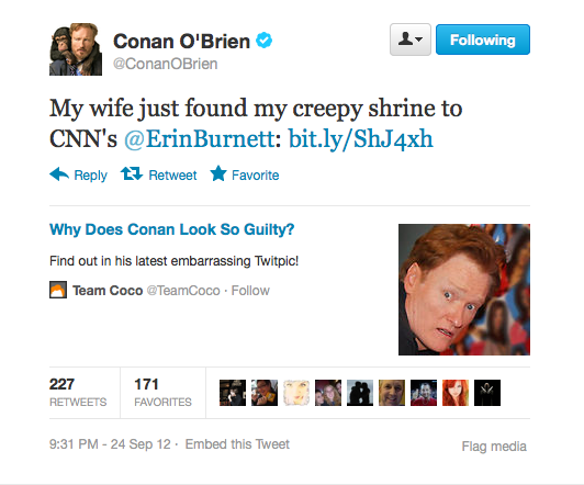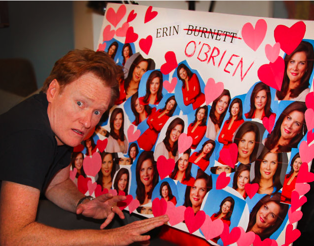 It looks like [One Of My Male Co-Workers Who Shall Remain Nameless] isn’t the only one who harbors a huge crush on CNN anchor Erin Burnett. TBS’ Conan O’Brien — like my Nameless Co-Worker — keeps a collage full of Erin photos around his office. Although my co-worker’s has less hearts, more Lisa Frank rainbow kitten stickers.