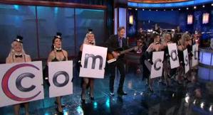 What followed was a string of compliments from O’Brien and his sidekick, Andy Richter, before O’Brien grabbed a guitar (decked out with Comcast sticker) and started in on a Comcast-related song. Sample line from Richter: “Since they’re our new boss, some people might assume that we’re just kissing ass-tic.”