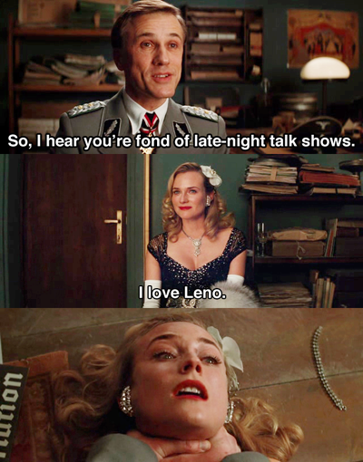 It’s been making the rounds for a few days, with various permutations (Team Jacob or Team Edward? etc.) This version comes via meme-incubator Livejournal hub OhNoTheyDidnt but has been snaking across Reddit and Digg and other content hubs for the past week or so. Of course Mediaite has a special affinity for Inglourious Basterds via Bear Jew 5QQer and Aughts columnist Eli Roth, but we’re also fans of stunning double agent Diane Kruger and the extremely non-Landa like Christoph Walz, seen chocking Kruger’s Bridget von Hammersmarck above but seen here humbly accepting his Golden Globe for Best Supporting Actor. Oscar, watch out. Also, upon rewatch we were reminded that Mike Myers was in the film, and he, of course, is Canadian.