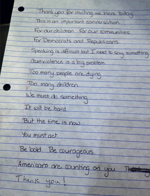 At Wednesday’s hearing, Rep. Giffords struggled, courageously, to urge lawmakers to “Be bold, be courageous. Americans are counting on you,” reading her statement from a handwritten sheet of paper: