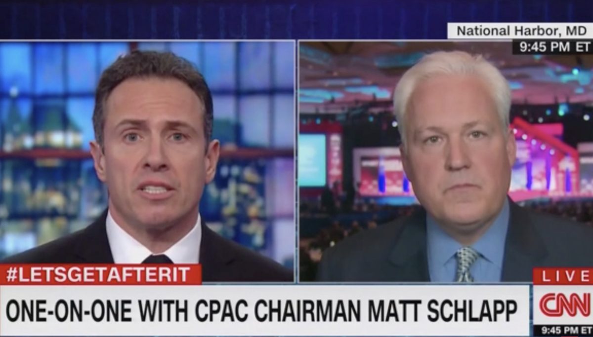 Prior to President Donald Trump‘s big speech today, CPAC aired the video of CNN’s Chris Cuomo clashing with ACU Chairman Matt Schlapp last night.