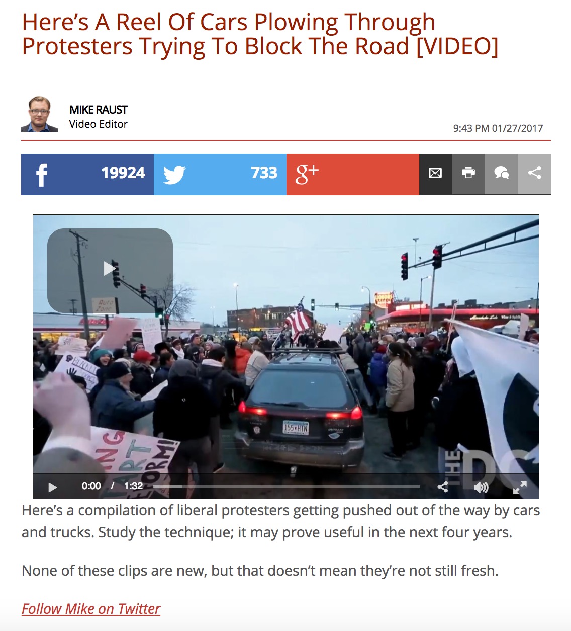 The Daily Caller in January posted a video compilation of “cars plowing through protesters,” instructing readers to “Study the technique” as “it may prove useful in the next four years.”