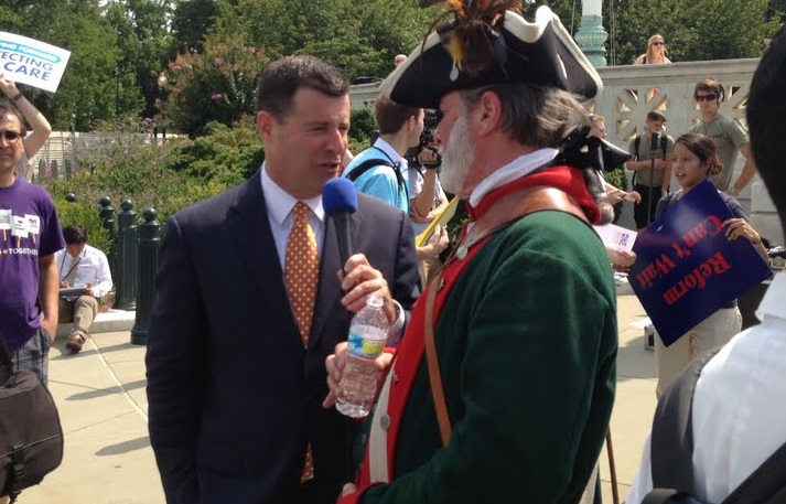 It took more than a bleeding heart and a webcam to pull off Take Action News‘ coverage of the SCOTUS decision. Without the equipment and resources of their TV competitors, Shuster and co. had some unique challenges to overcome. The night before the decision, they set up some chairs, stools, and an astroturf carpet for the next day, which Shuster left in the care of some spectators who were camping out when Capitol Police insisted someone had to stay with the equipment.
