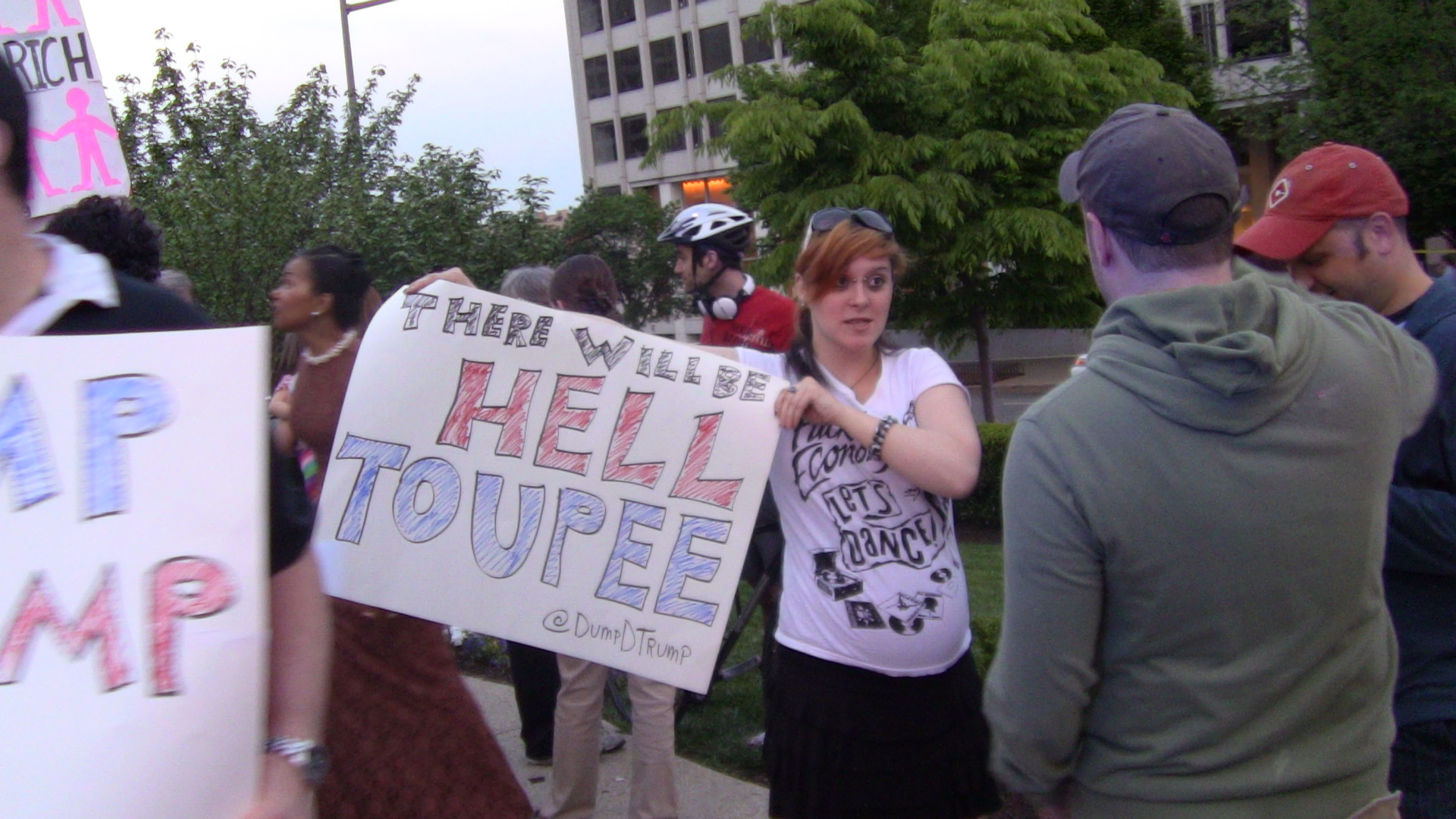 Between parties at Saturday’s White House Correspondents Dinner, I spotted a small group of protesters outside the Washington Hilton who were trying to draw attention to their Twitter campaign against undeclared GOP frontrunner Donald Trump. Under the Twitter name @DumpDTrump, the group is trying to make advertisers aware of their objections to Trump’s attacks on President Obama. Former MSNBC anchor David Shuster wandered by to call Trump a “jackass,” and Rev. Al Sharpton also voiced his agreement before being frightened away by a boisterous Code Pink-er.