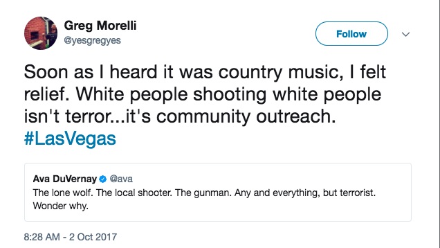 Greg Morelli, co-owner of Max’s Deli in the northern Chicago suburb of Highland Park, was highly active on Twitter the morning after the massacre. In a tweet replying to one made by filmmaker Ava DuVernay, he wrote “Soon as I heard it was country music, I felt relief. White people shooting white people isn’t terror… it’s community outreach.”