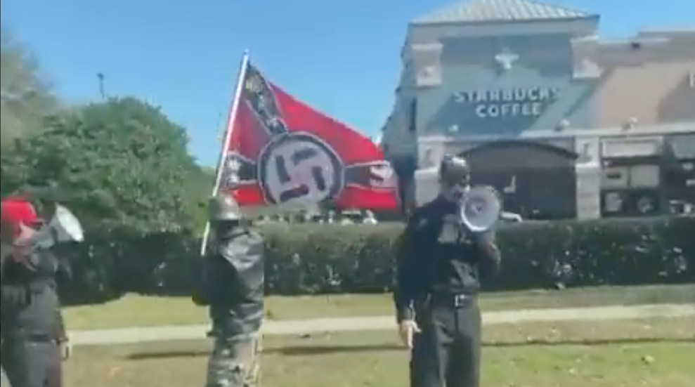 Video circulating on Twitter showed a handful of people standing outside a strip mall in the Orlando area of Waterford Lakes. The demonstrators can be seen with Nazi flags, doing the Nazi salute, and yelling anti-Semitic slurs. Another video showed the group beating up a man.