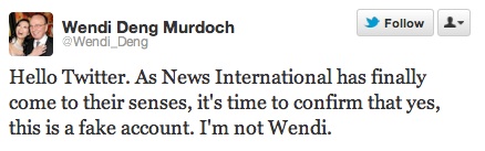In perhaps the biggest lapse in Twitter’s verification history, the Wendi_Deng Twitter account, purporting to be News Corporation CEO Rupert Murdoch‘s wife, has been confirmed as a fake.