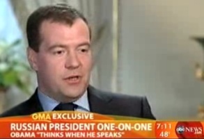 Fresh off of the nuclear arms treaty signing with Barack Obama , Russian President Dmitry Medvedev appeared on Good Morning America this morning, and told ABC’s George Stephanopoulos that President Obama is “thinker” unlike “other people.” Lots of mutual respect between Medvedev and Obama gets revealed in this interesting clip, the transcript and video below: