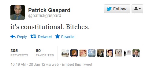 In the minutes following the announcement of the Supreme Court’s decision to uphold President Obama‘s Affordable Care Act, Democratic National Committee Executive Director Patrick Gaspard channeled comedy legend Dave Chappelle in summing up the feelings of many Obama supporters, tweeting “It’s constitutional. Bitches.”