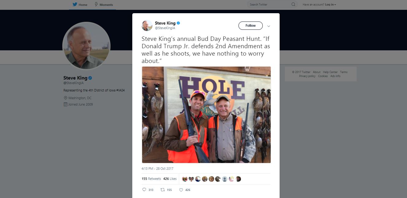 While it seems the two actually went pheasant hunting and did not in-fact hunt down plebeians, the GOP congressman did accidentally tweet a photo of the two posing with firearms captioned: “Steve King’s annual Bud Day Peasant Hunt. ‘If Donald Trump Jr. defends 2nd Amendment as well as he shoots, we have nothing to worry about.'”