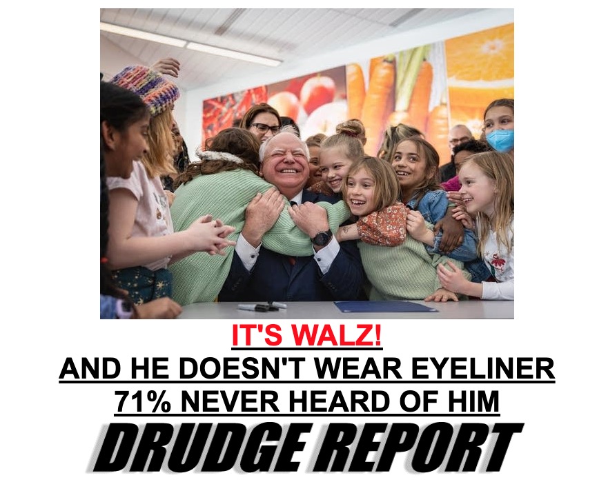 Matt Drudge is using the occasion of Minnesota Governor Tim Walz’s announcement as Vice President Kamala Harris’s running mate to ridicule the apparent use of eye makeup by Senator and Vice Presidential hopeful JD Vance.