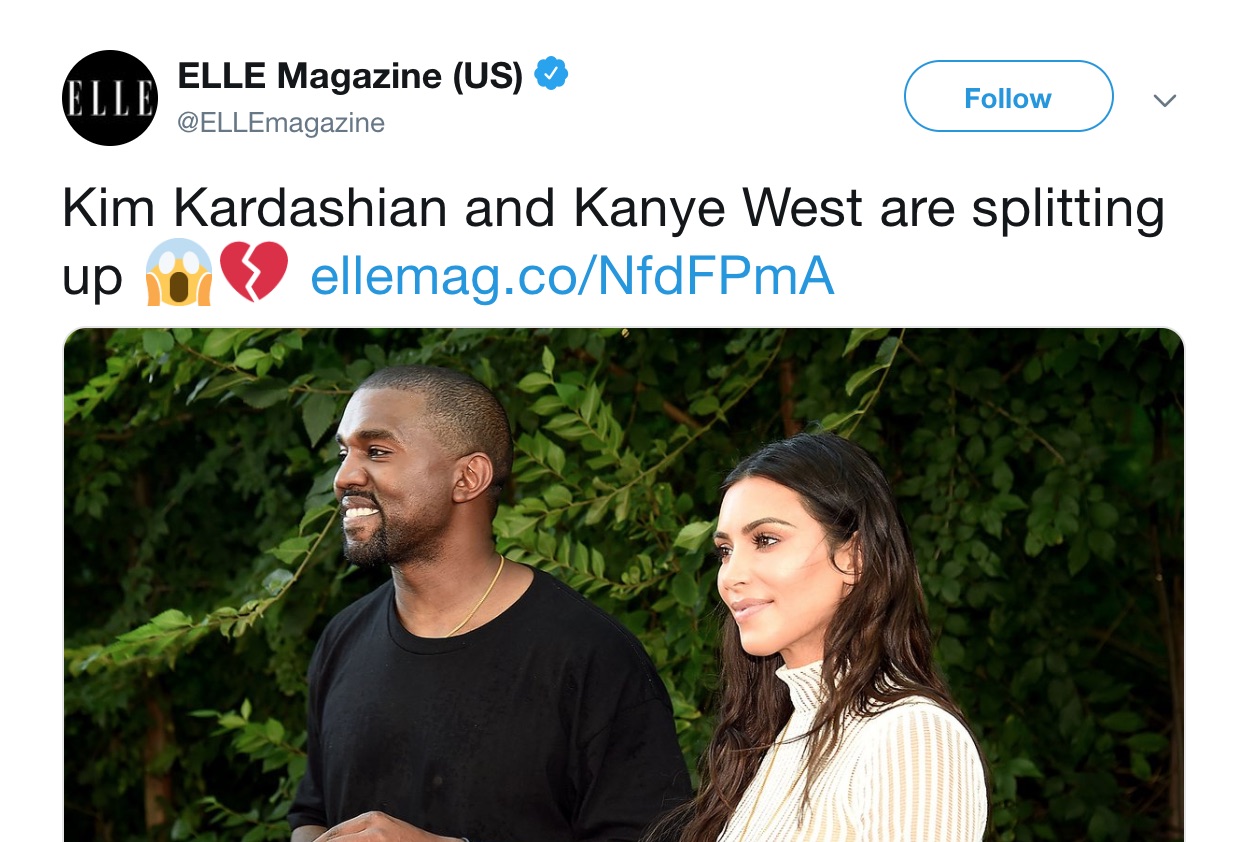 Elle Magazine‘s official Twitter account “reported,” Thursday, that Kanye West and Kim Kardashian are “splitting up.”